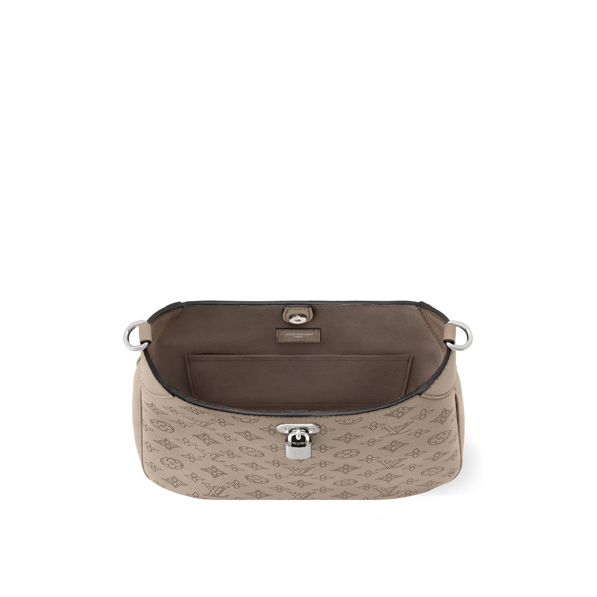 The All Around MM is a sophisticated everyday style. It is crafted from signature Mahina leather patterned with Monogram perforations, and is elevated with gold-toned hardware, including a decorative padlock that elevates the magnetic closure. The versatile design also features an LV leather charm and can be worn cross-body or over one shoulder.