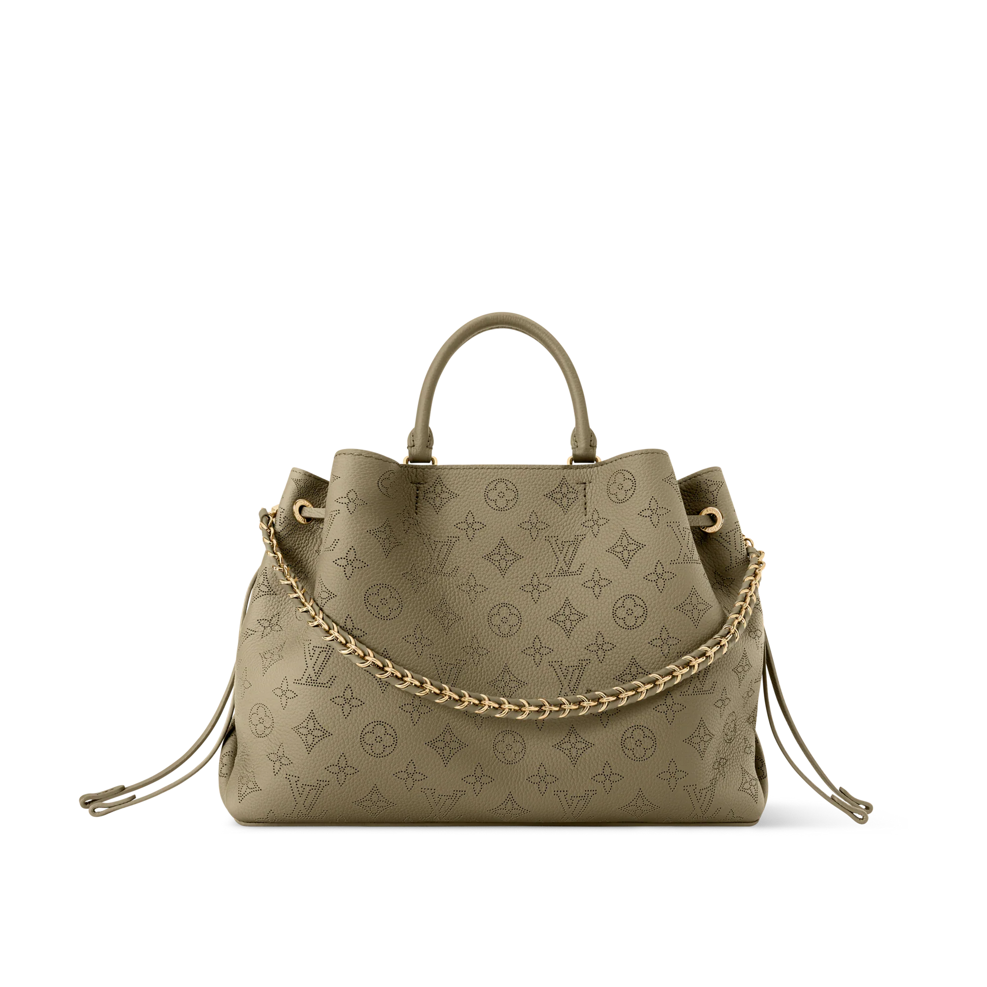 This seasonal edition of the Bella handbag makes an elegant choice for everyday. Designed in a sophisticated Rosemary Green palette, it is crafted from Mahina leather decorated with Monogram perforations and is adorned with a light gold-toned braided chain. With multiple carry options, it is generously sized to fit essential items, including a laptop.