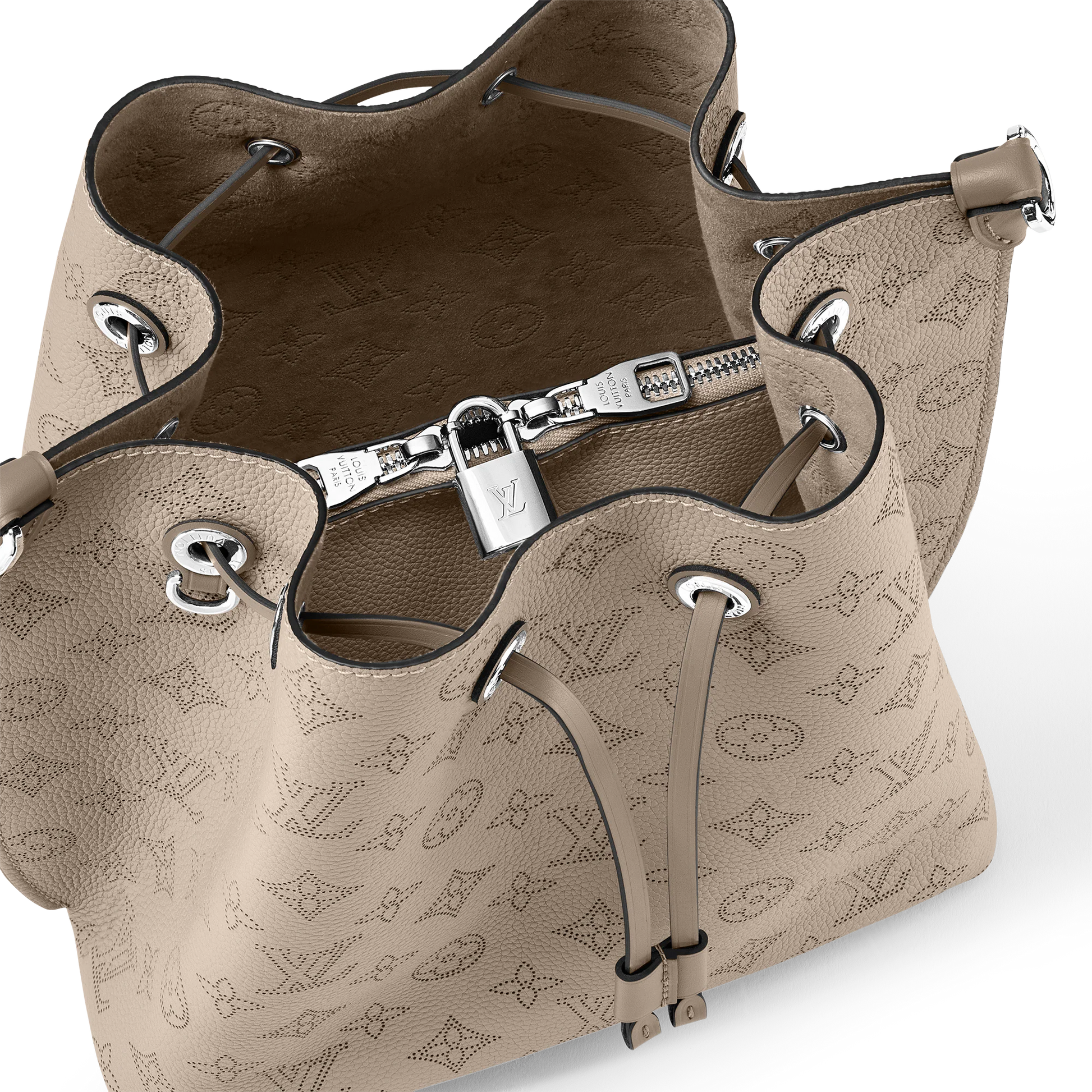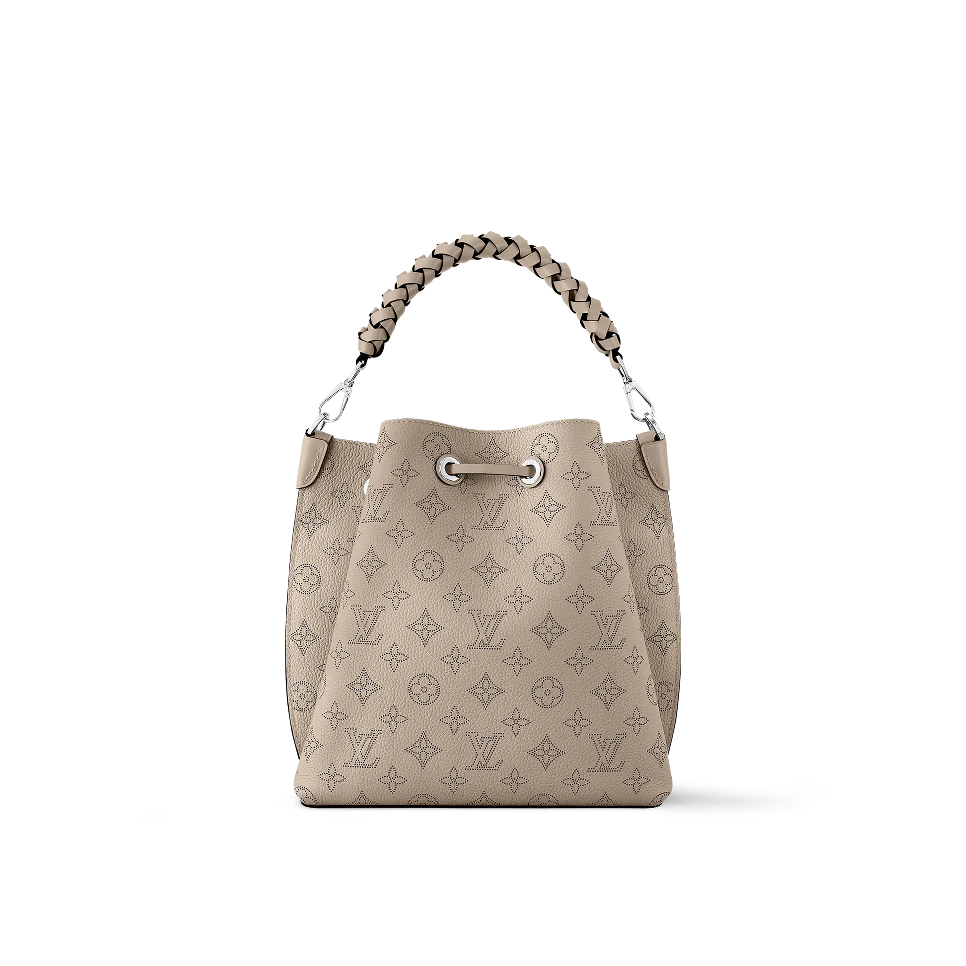 The Muria bucket bag is made from Mahina calf, a perforated leather with a discreet Monogram motif. Supple and sophisticated, it is a pleasure to carry, either by the braided top handle or the long leather strap, which adjusts for short- and long-shoulder or hands-free cross-body wear. Crafted signature details include a name tag and keybell in smooth calfskin.